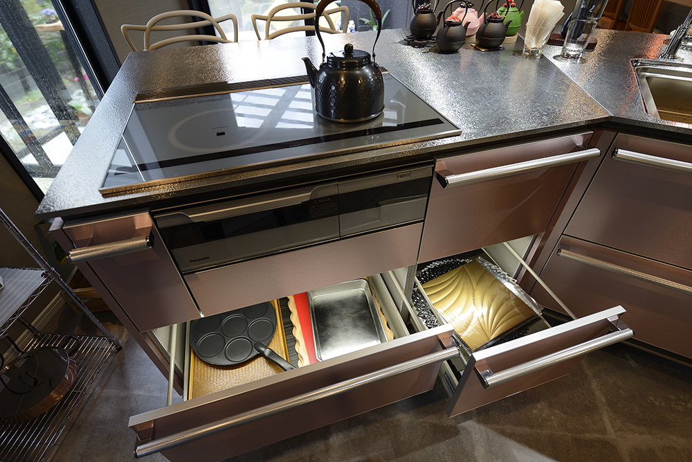ほかにも、引き出しを引き出すとLEDライトがついたり、シンクに2本の水栓+浄水器をつけても